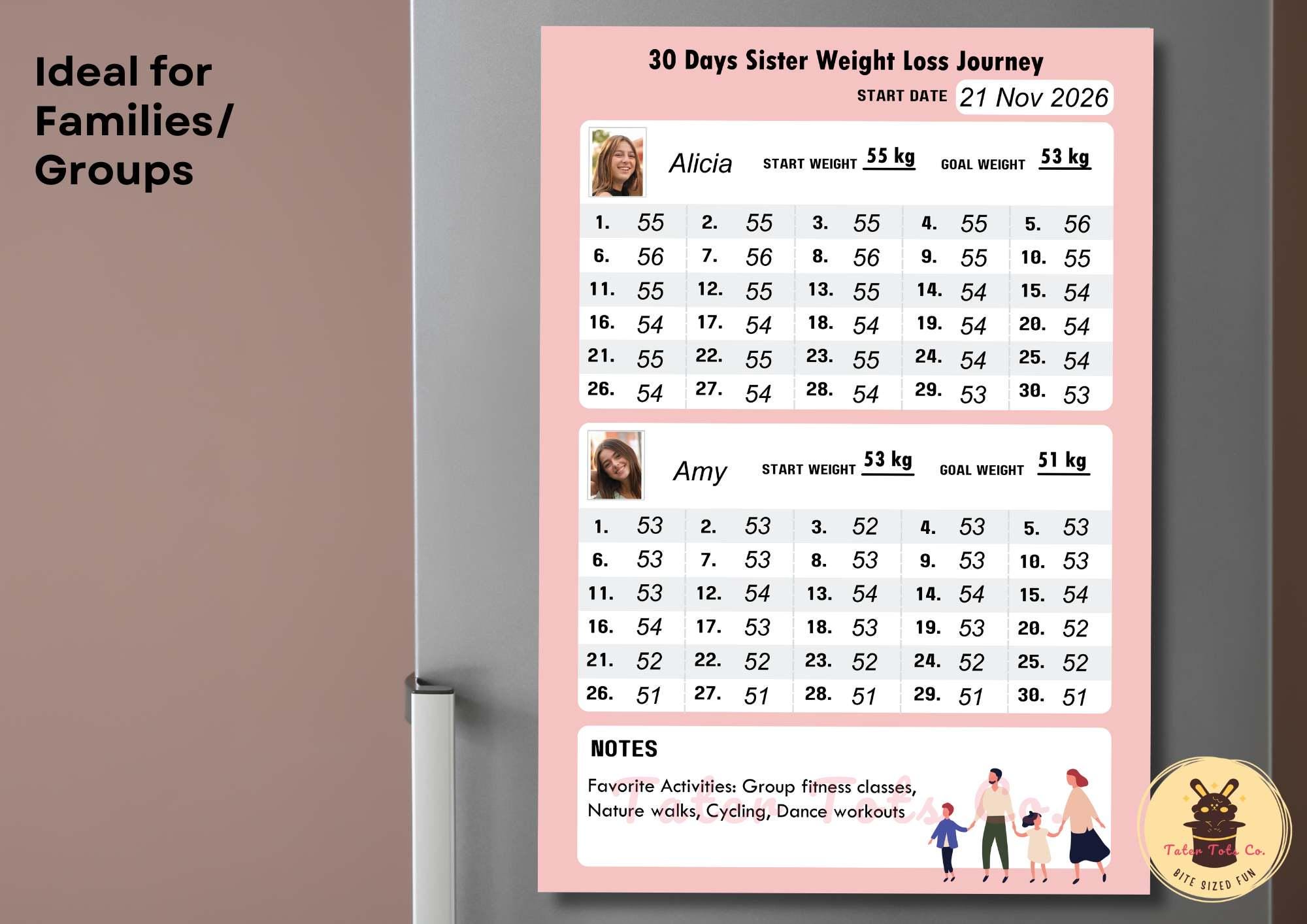 Each page of the tracker allows you to monitor the progress of two members simultaneously, making it easy to stay motivated while exercising in groups. Personalize it with your photos/avatar and goals.