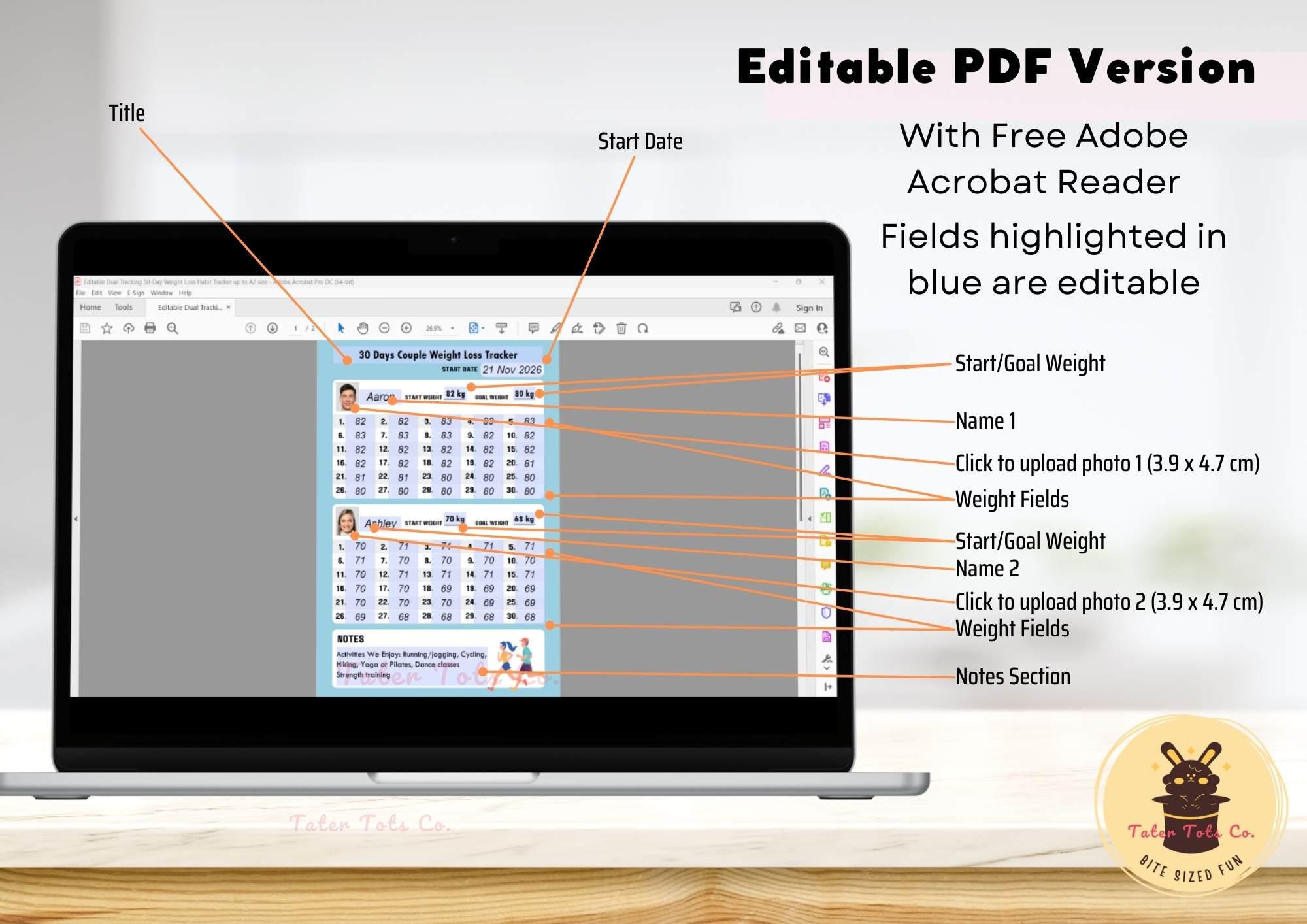 Stay motivated and achieve your weight loss goals with our Editable 30-Day Dual Tracking Weight Loss Habit Tracker! This customizable habit tracker is suitable for couples, families, friends, and groups looking to achieve their fitness goals together.