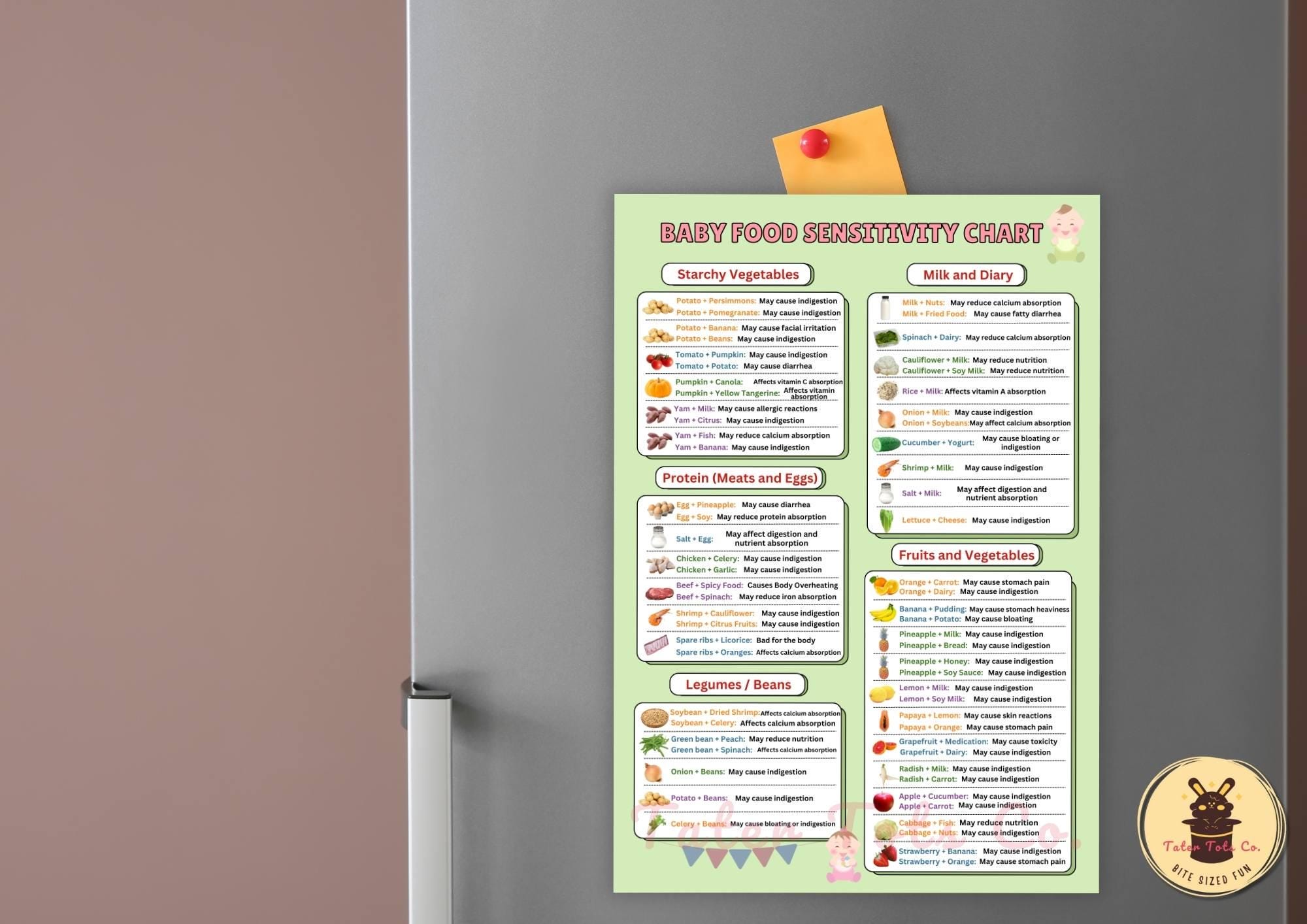 Discover the comprehensive "Baby Food Sensitivity Chart" designed to help parents navigate the complex world of baby nutrition. This reference poster provides general information on food pairs that may cause adverse reactions in babies, ensuring your child's diet is safe and nutritious.