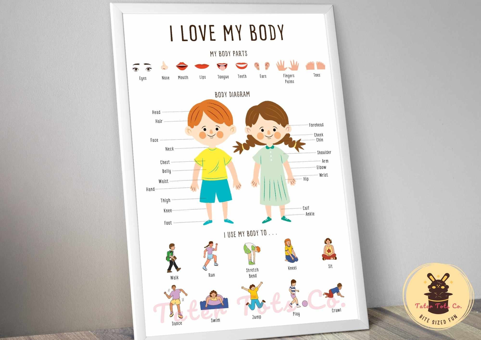 Body Parts Preschool Poster: Anatomy Learning, Action Words (Printable PDF)