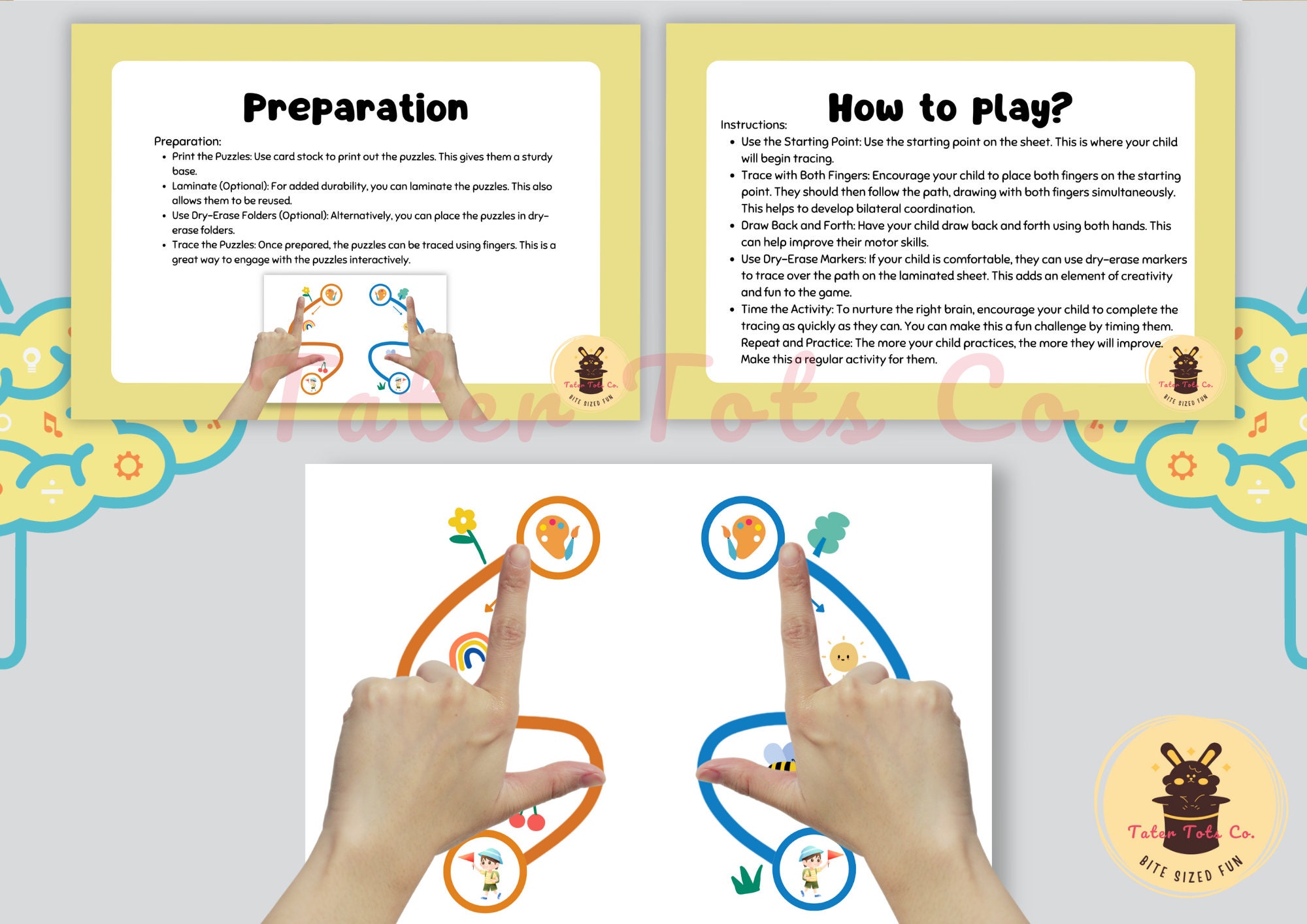 Draw back and forth with both hands or use dry-erase markers to draw on a laminated sheet. Getting children to complete them quickly will also help to nurture their right brain.