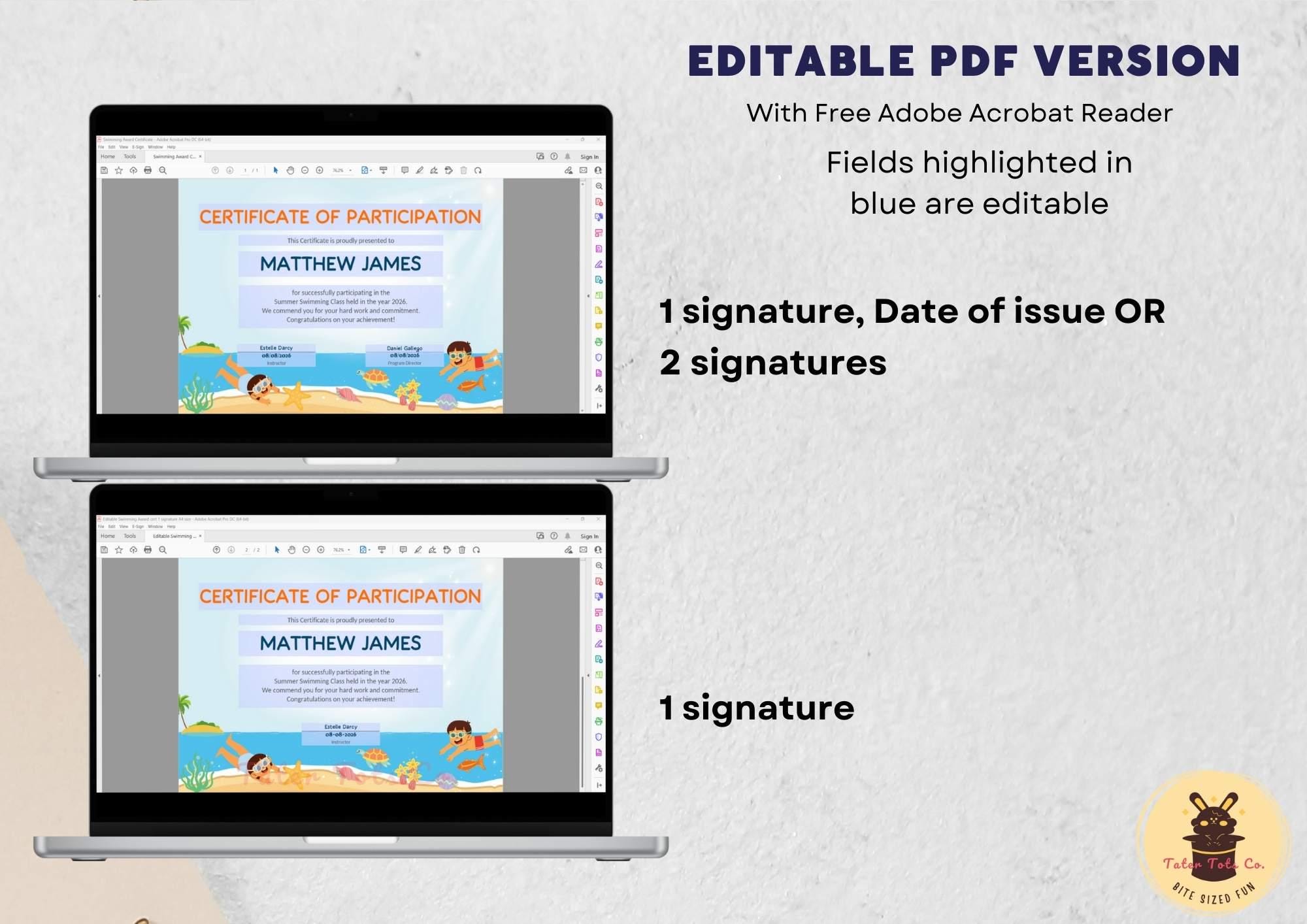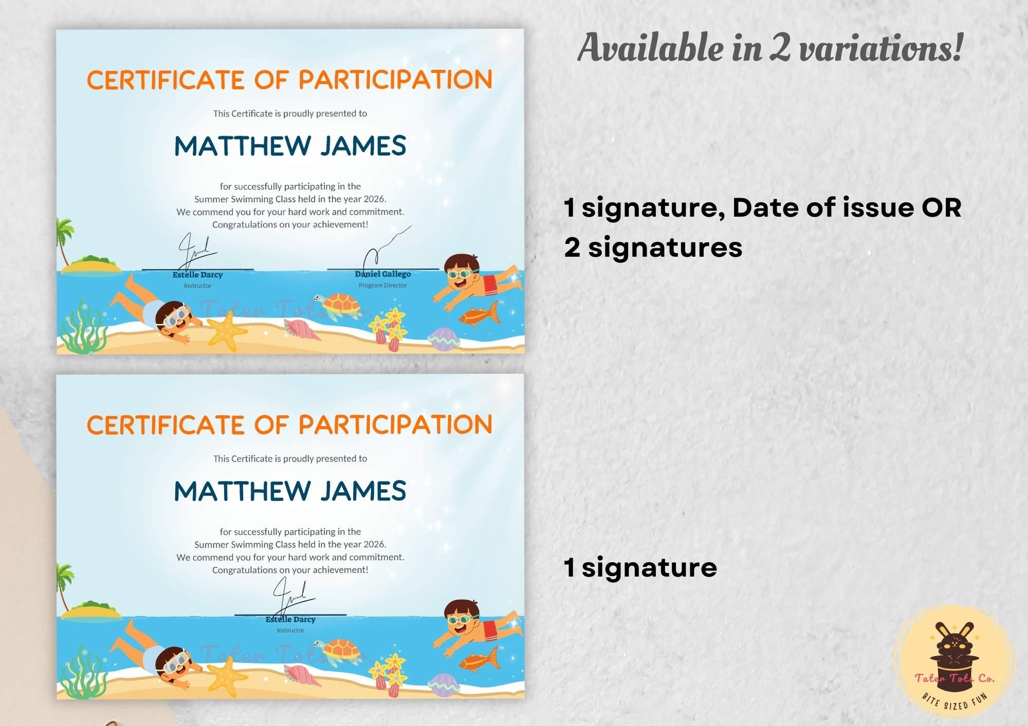 • Swimming Award certificate A4 size (2 variations with single or double signature lines)