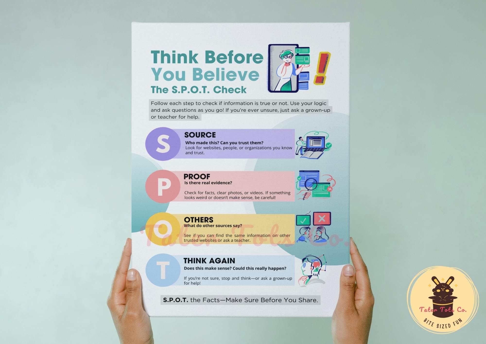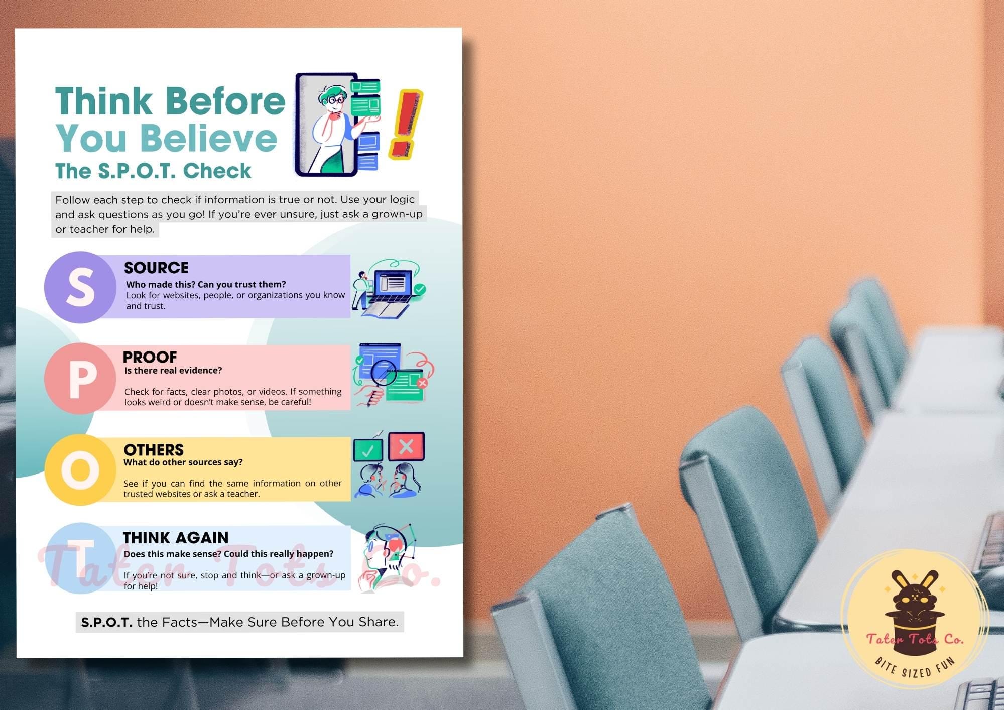 Help children develop essential fact-checking skills with this engaging, printable infographic available as an instantly downloadable resource. The S.P.O.T. acronym (Source, Proof, Others, Think Again) makes it easy for young children and elementary students to learn how to verify information and stay safe online. This visually appealing, classroom-ready resource is suitable for teachers, parents, and educators who want to promote digital literacy, critical thinking, and responsible internet use.