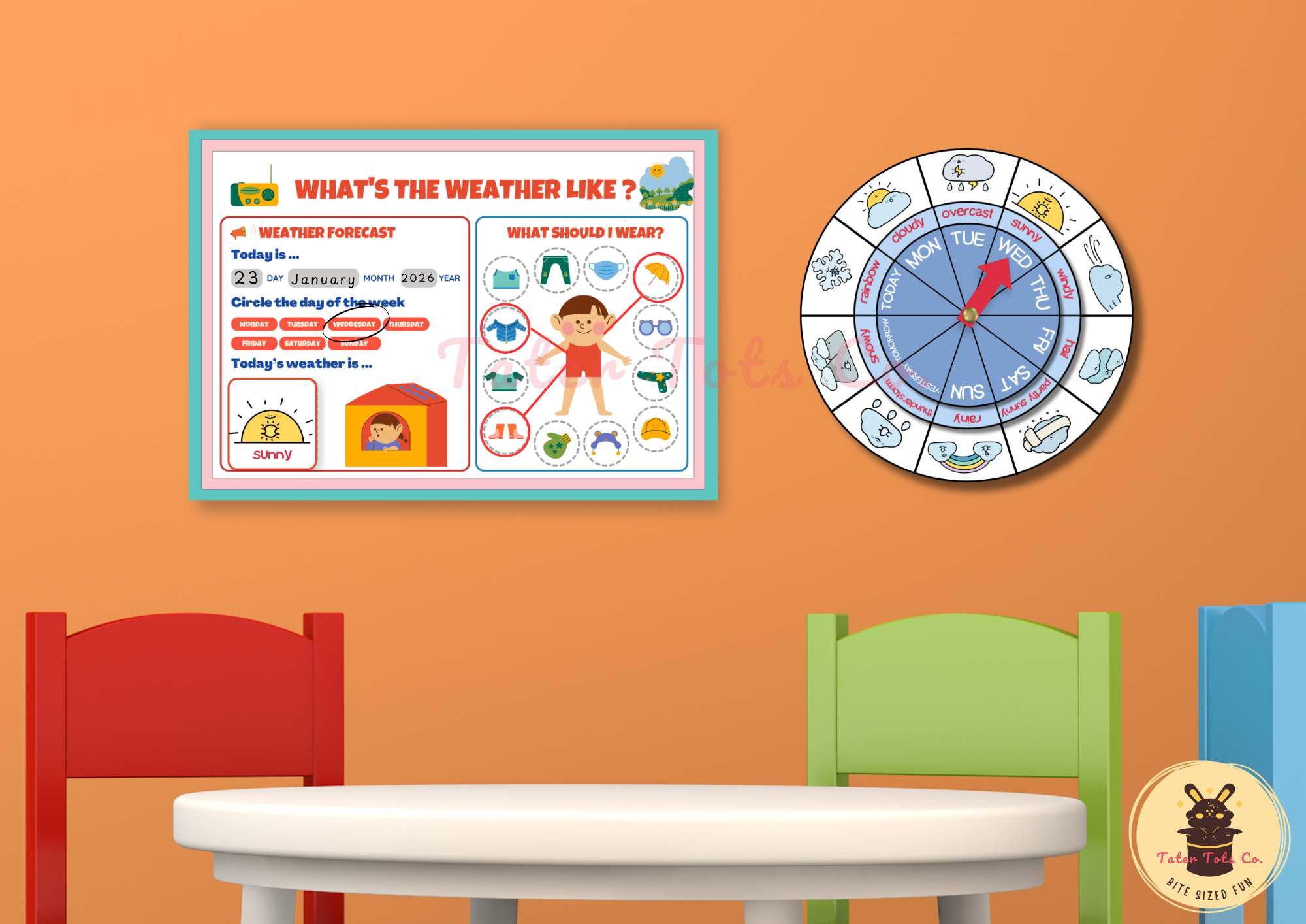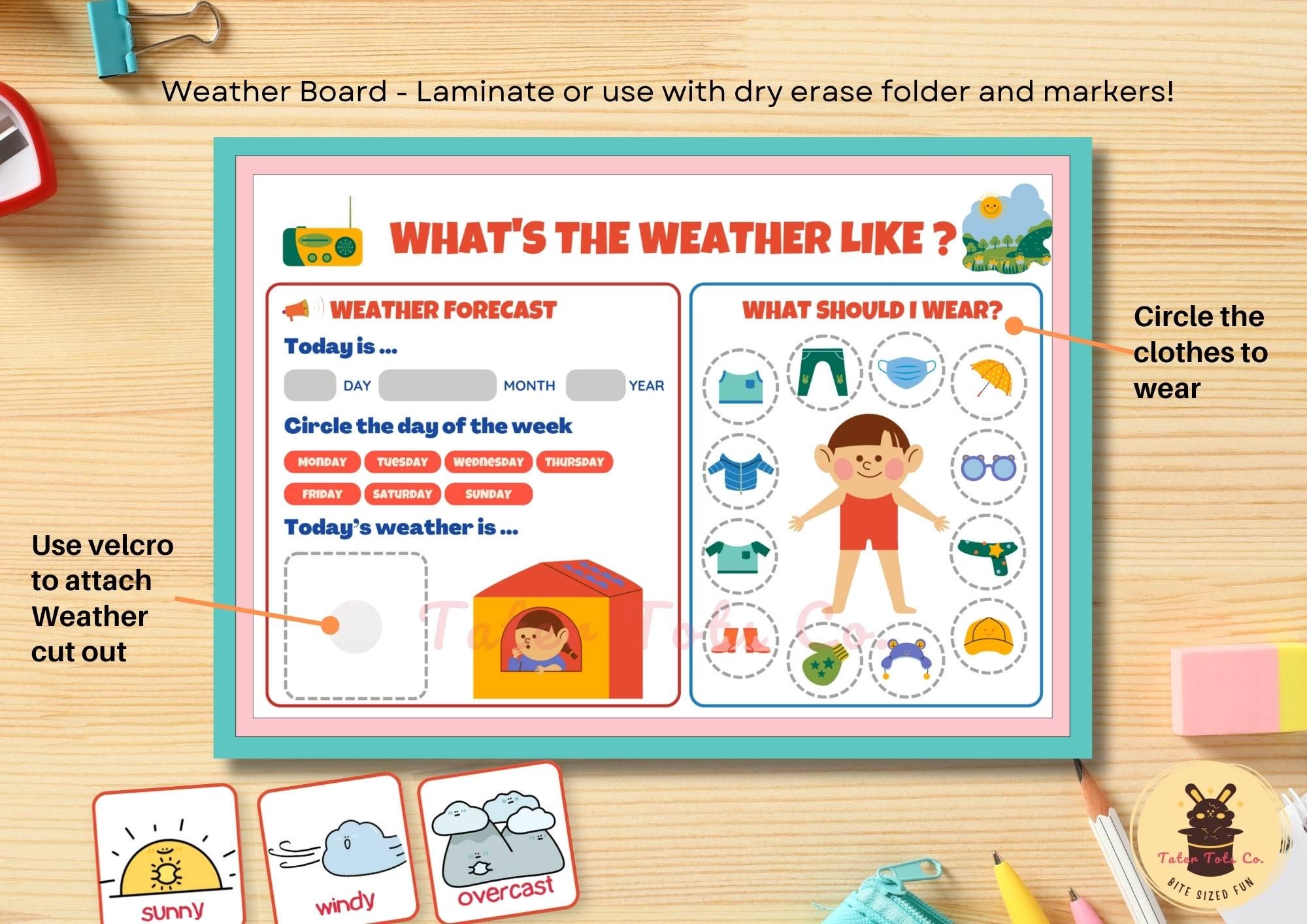 Make learning about the weather fun with this interactive weather chart with cute hand-drawn weather illustrations! This resource includes a weather wheel and interactive dry-erase board template with a dress-up activity to help kids learn what to wear in different weather conditions. Suitable for preschool, kindergarten, homeschool, or classroom use. Instantly download - print, play, or display on your bulletin board today!