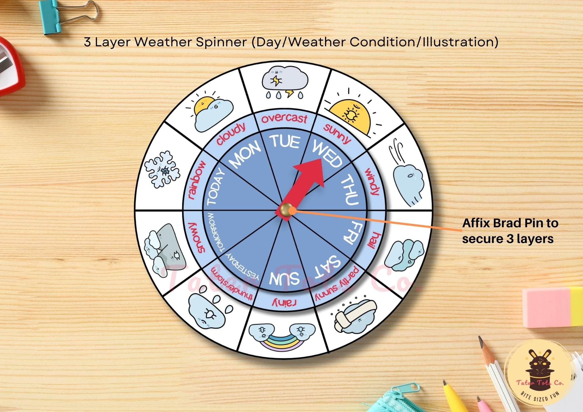 • Weather Spinner Template (includes 10 common weather conditions, 3 layers, and an arrow - Day/Weather/Illustration)