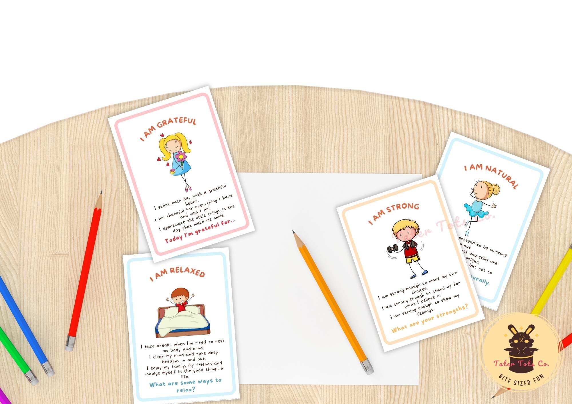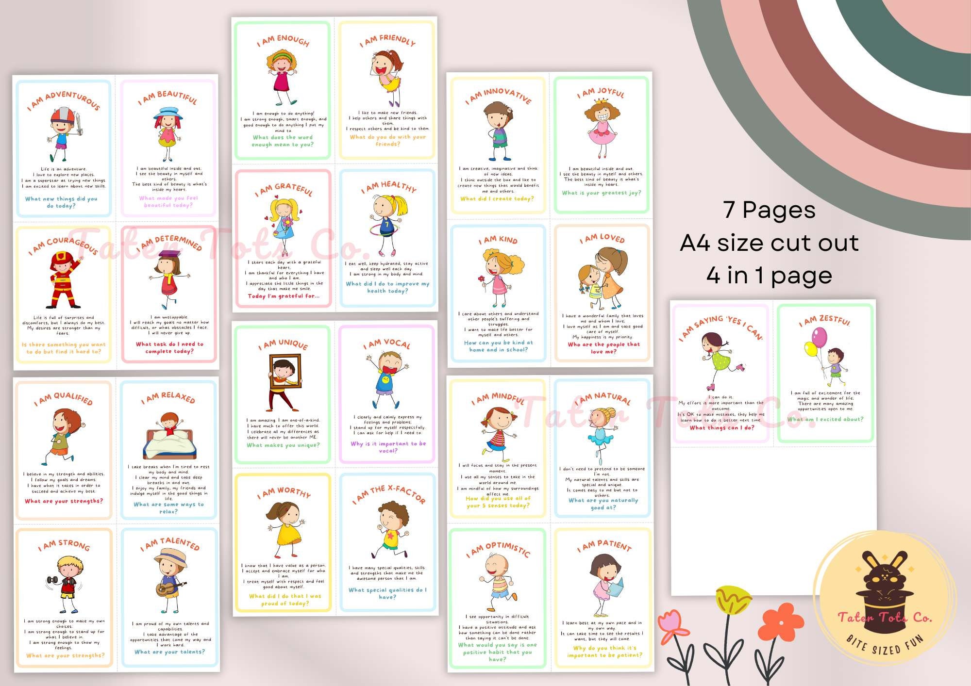 Kids Affirmations Cards A4 size cut out (4 cards on each page - convenient to cut and use)