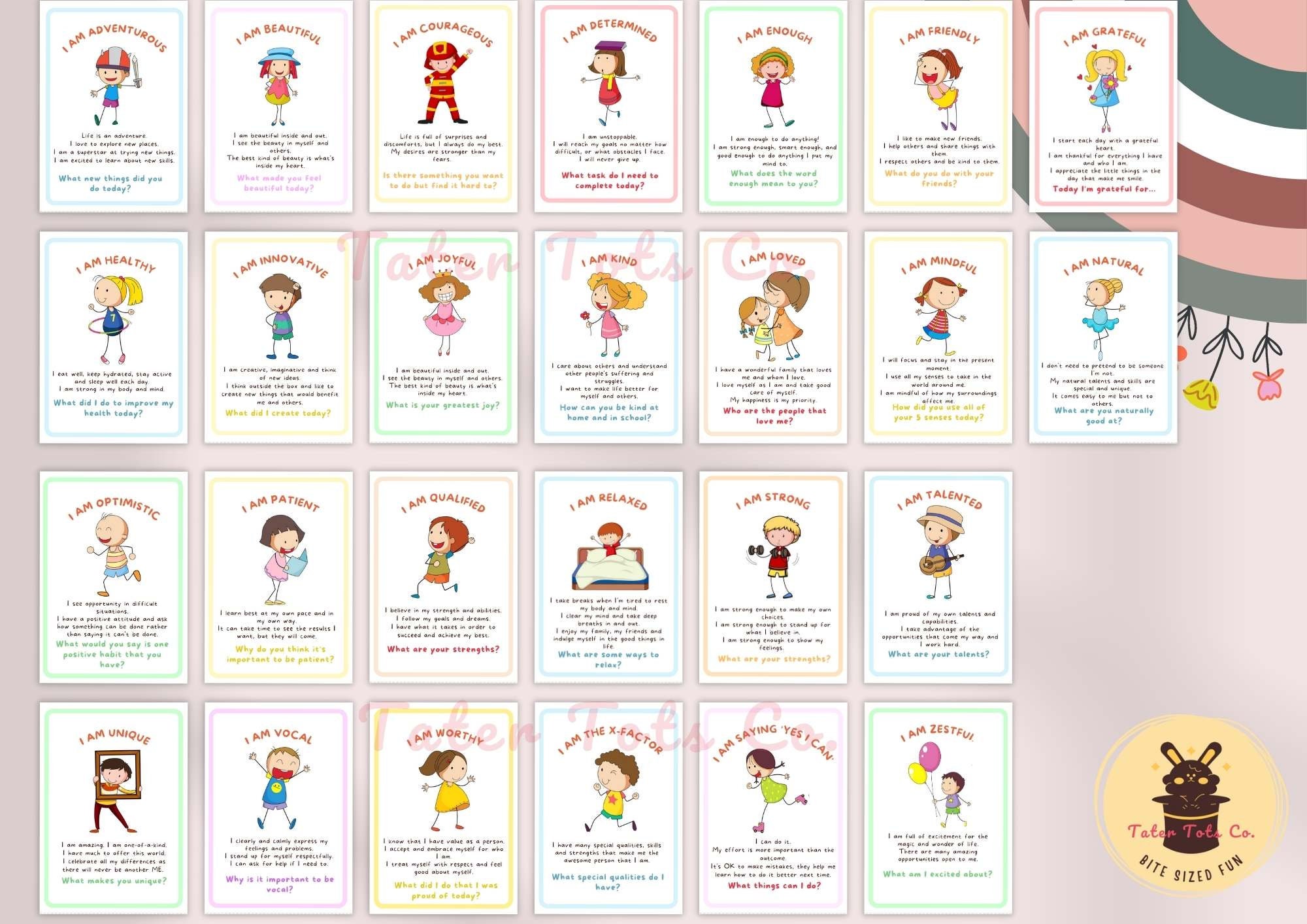Introduce your little ones to the power of positive affirmations with our Kids Affirmations Alphabet ABC set. These cards with cute children's illustrations are a fun way to teach children the alphabet while instilling confidence and positivity. Each card features a letter of the alphabet accompanied by positive affirmation and journal gratitude prompts, promoting a growth mindset and empowering young minds. Great for classroom activities or home learning,