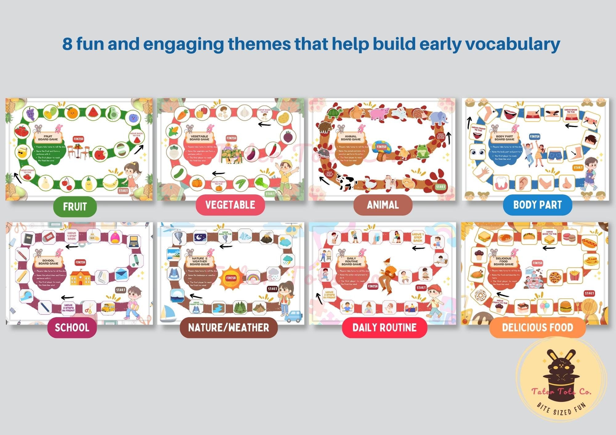 This is a bundle of 8 preschool vocabulary learning board games that aim to transform learning into a fun and interactive experience for children. Each game features a different theme, keeping kids engaged and excited to expand their knowledge.
