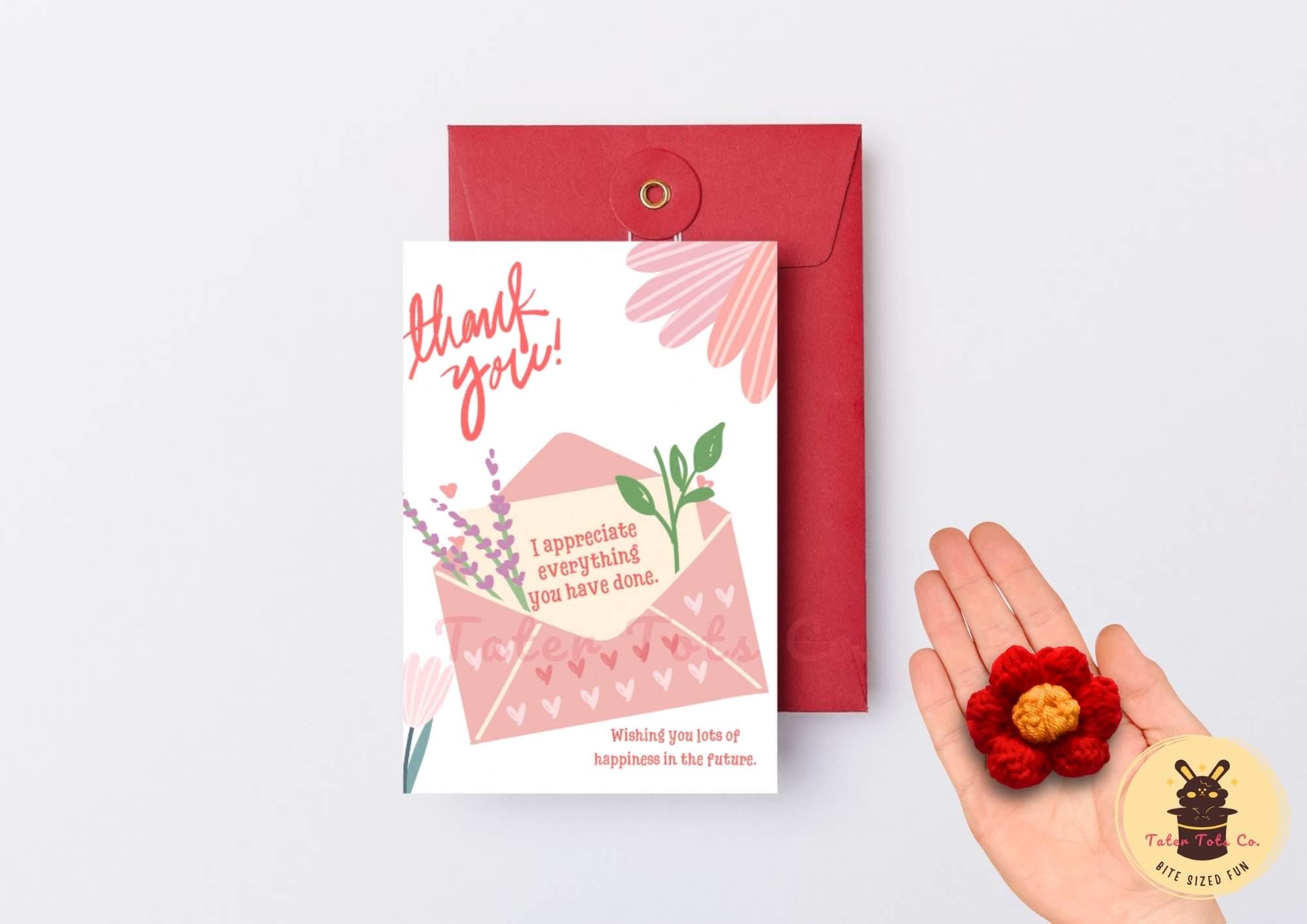 Create a heartfelt "Thank You" card for your favorite teacher (or anyone special!) with this easy-to-use template. This card features a beautiful, puffy crochet flower that adds a unique, handmade element to your greetings.
