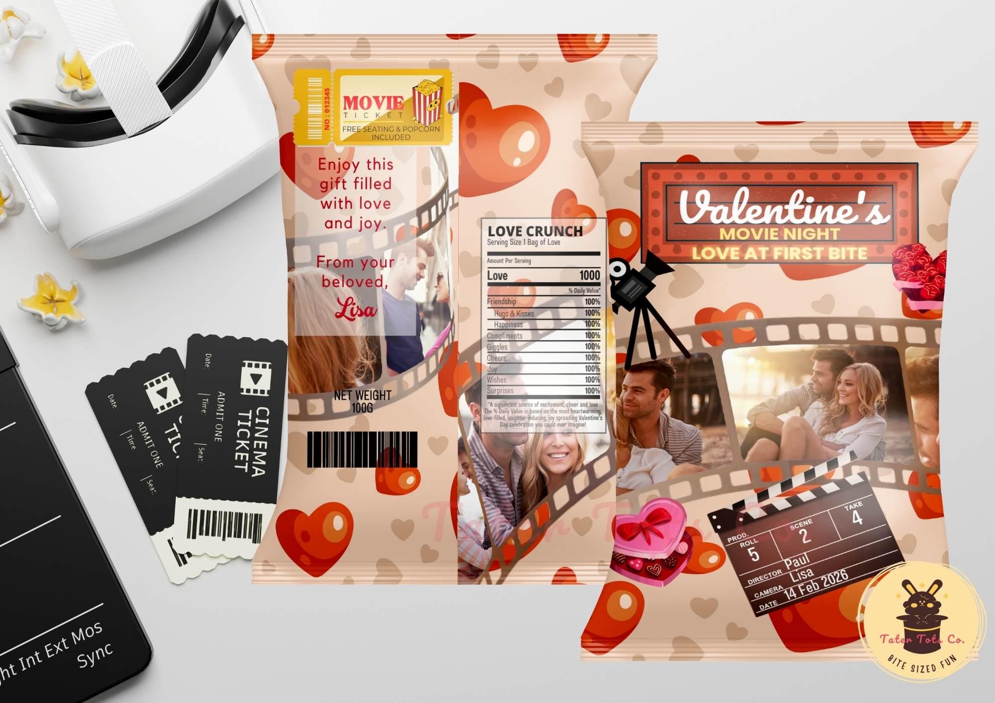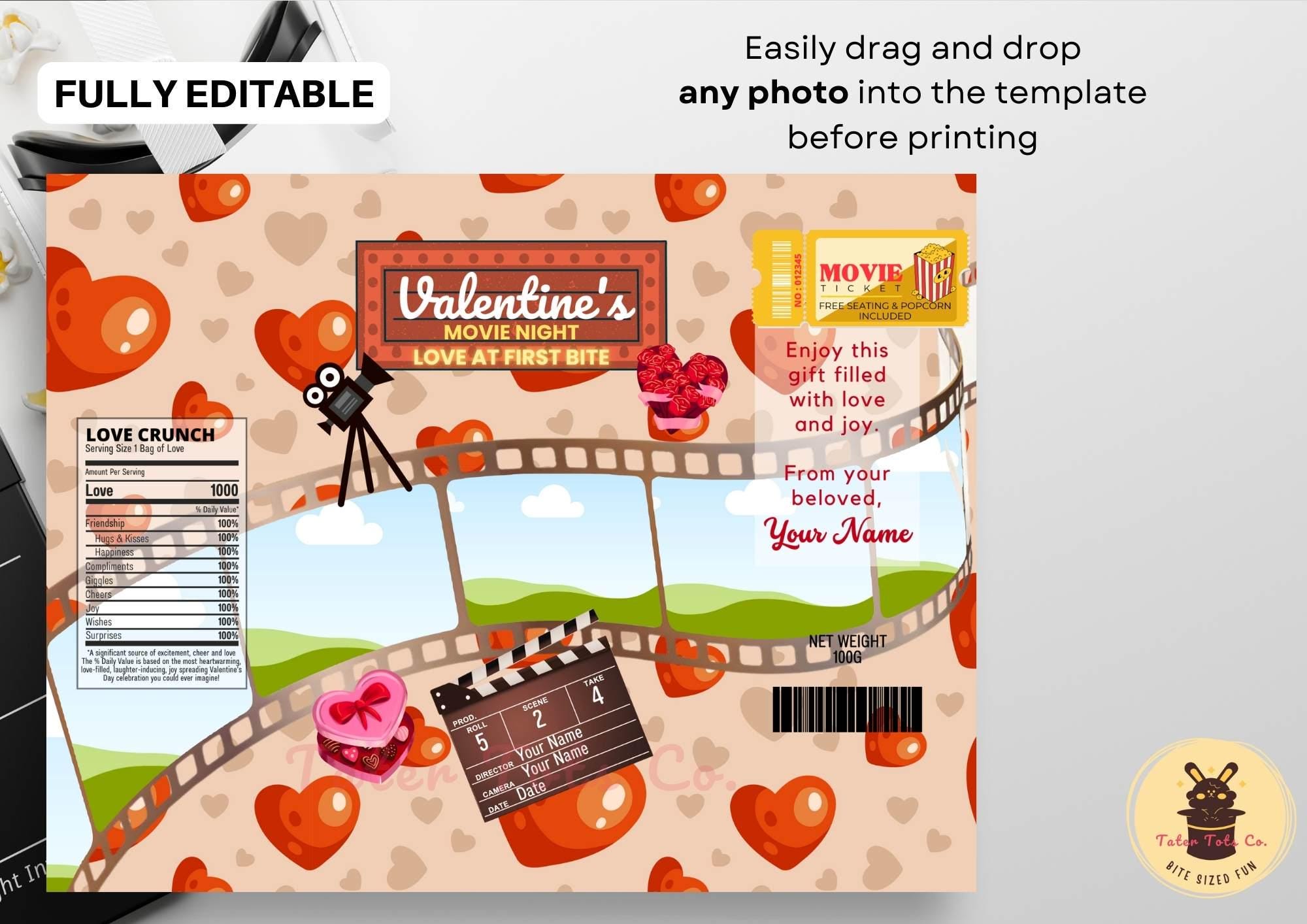 Valentine Movie Night Photo Collage Frame Film Roll Heart Background Chip Bag Canva Template | Fully Editable Gift Pack Label Instant Access